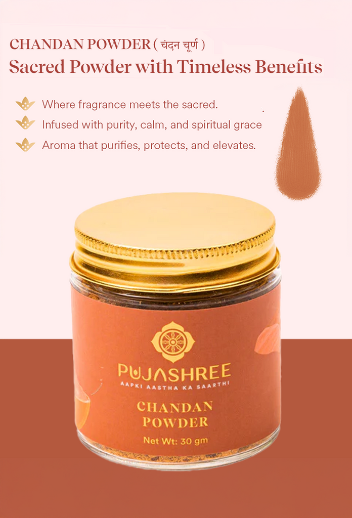 Embrace the most sacred gandha (fragrance) of Sanatan Dharma with Pujashree Chandan Powder. This is 100% pure, sattvic (pure) sandalwood powder, the ultimate anulepan (sacred anointment) for all deities. The aroma of chandan (sandalwood) is revered as the fragrance of the gods, believed to be cooling, purifying, and deeply meditative. It is the foundational gandha (fragrance) for tilak and abhishek (sacred bathing) in all forms of Karmakand (Vedic ritual).