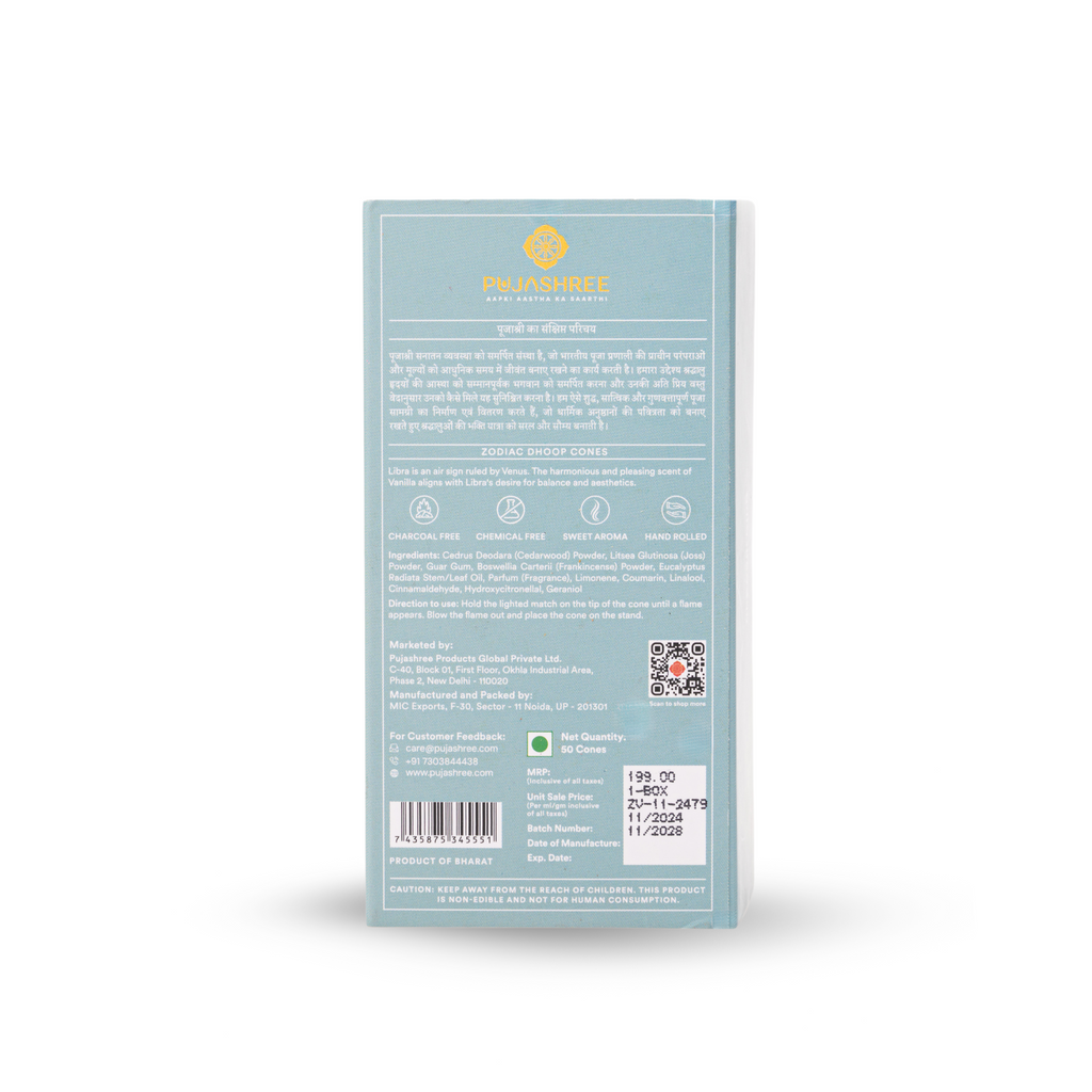 Experience the calming and serene fragrance of Pujashree Zodiac Dhoop Cones – Libra, carrying the sweet essence of Vanilla. Hand-rolled with devotion and free from charcoal or chemicals, these cones release a soothing aroma that reflects Libra’s natural sense of balance, peace, and harmony.