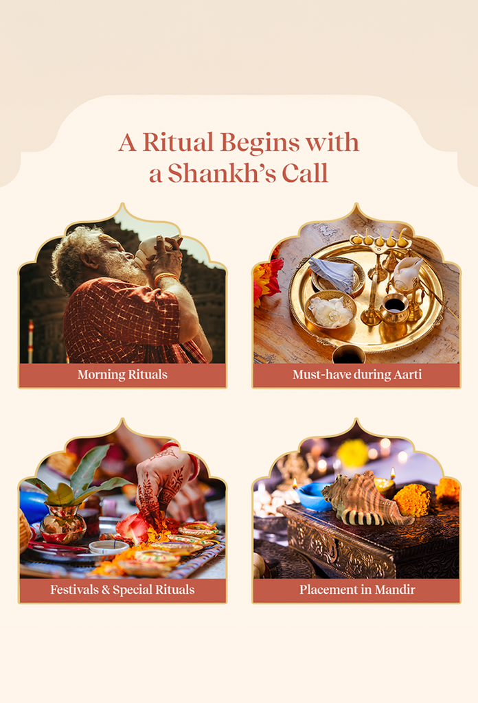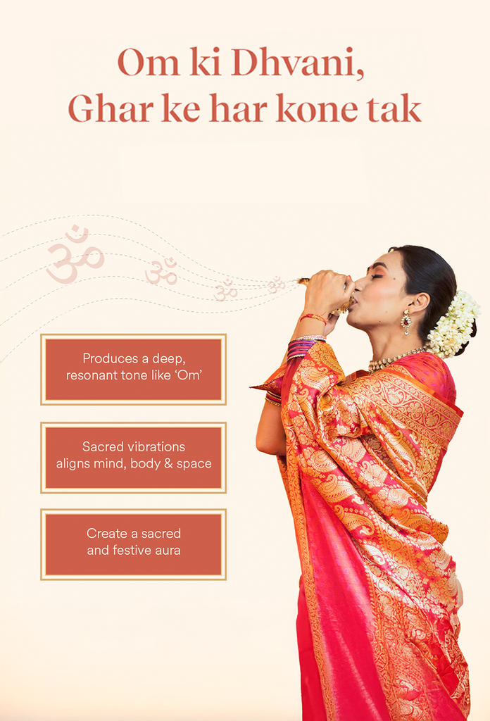Sacred Conch Shell: Crafted from a natural conch shell, it holds significant importance in Vedic rituals. Blowing the shankh is believed to purify the environment and invite positive vibrations.