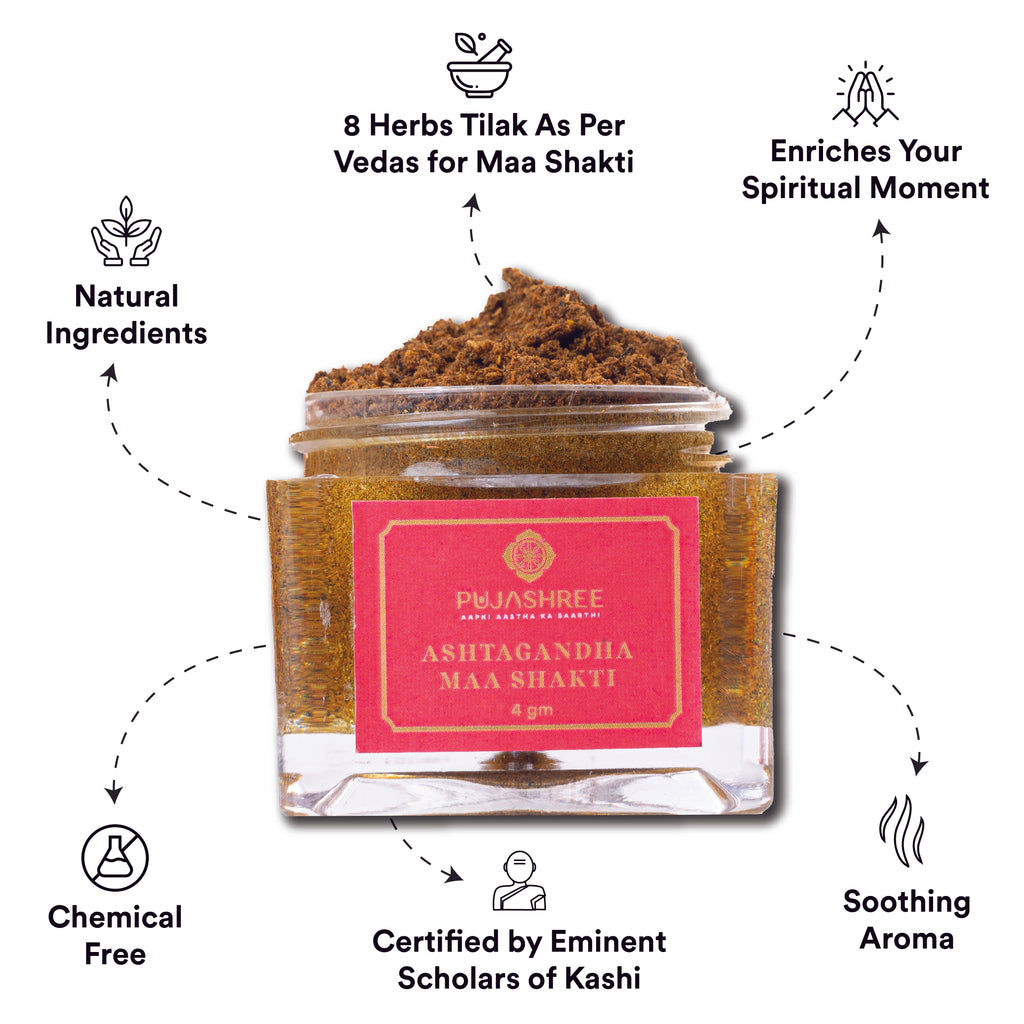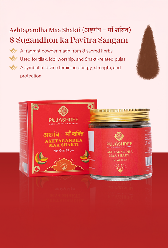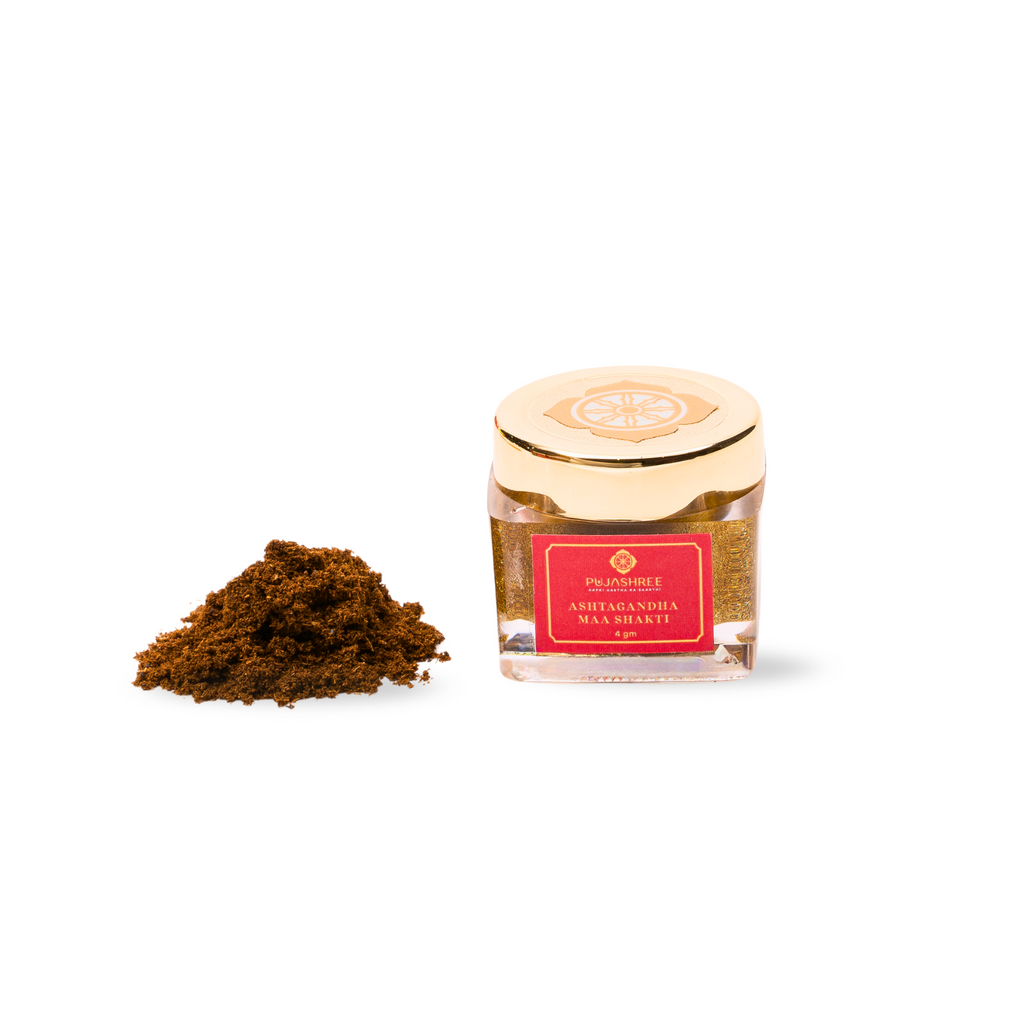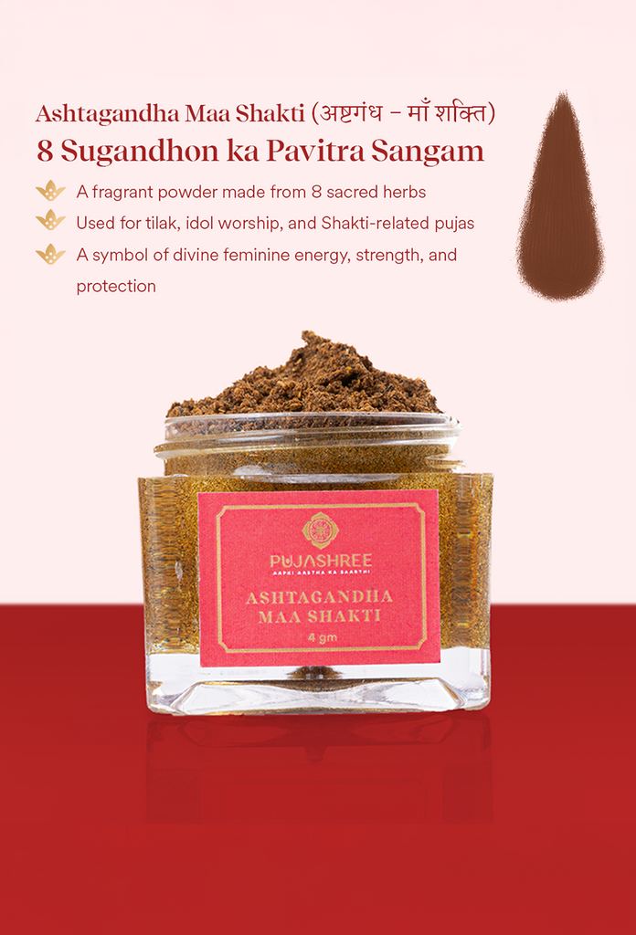 Embrace the divine aroma of Pujashree Ashtagandha – Maa Shakti Ji, a sacred blend of eight powerful herbs such as Bhimseni Camphor, Pashan Bhed, Jatamansi, and other auspicious herbs, prepared as per Vedic tradition and authenticated by scholars from Kashi.