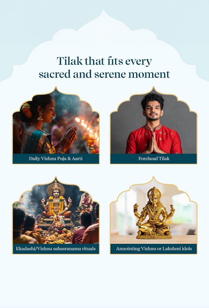 Applying this to deity not only symbolizes surrender to Bhagwan Vishnu but also fills the aura with purity, devotion and serenity. It is traditionally worn during daily pooja, Vishnu Sahasranama path, meditation, and on auspicious occasions like Ekadashi and Janmashtami.