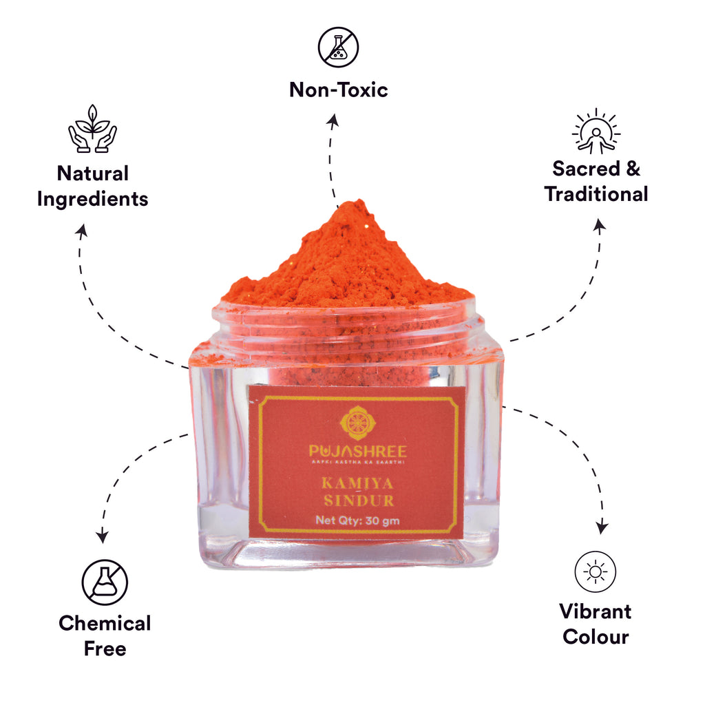 Crafted with care and made from natural, high-quality ingredients, Pujashree Kamiya Sindoor is more than just a cosmetic; it holds a strong spiritual significance. It symbolizes the sacred bond of marriage and invokes divine blessings for the well-being, prosperity, and happiness of the couple.