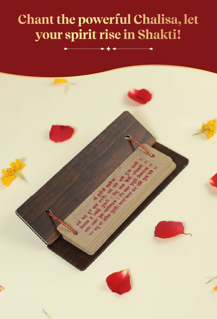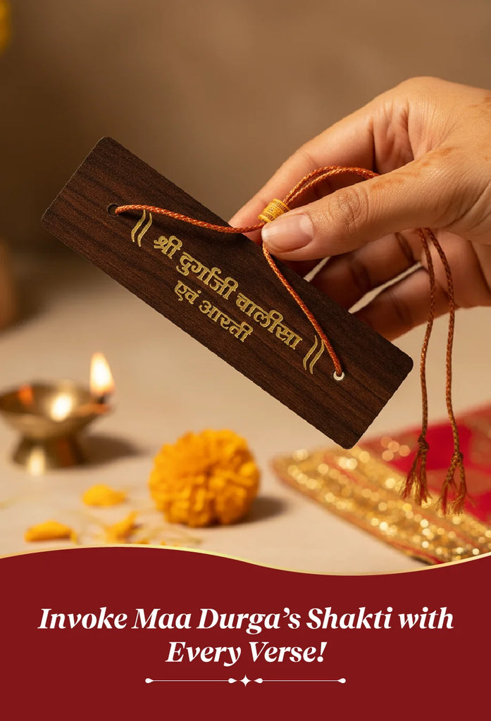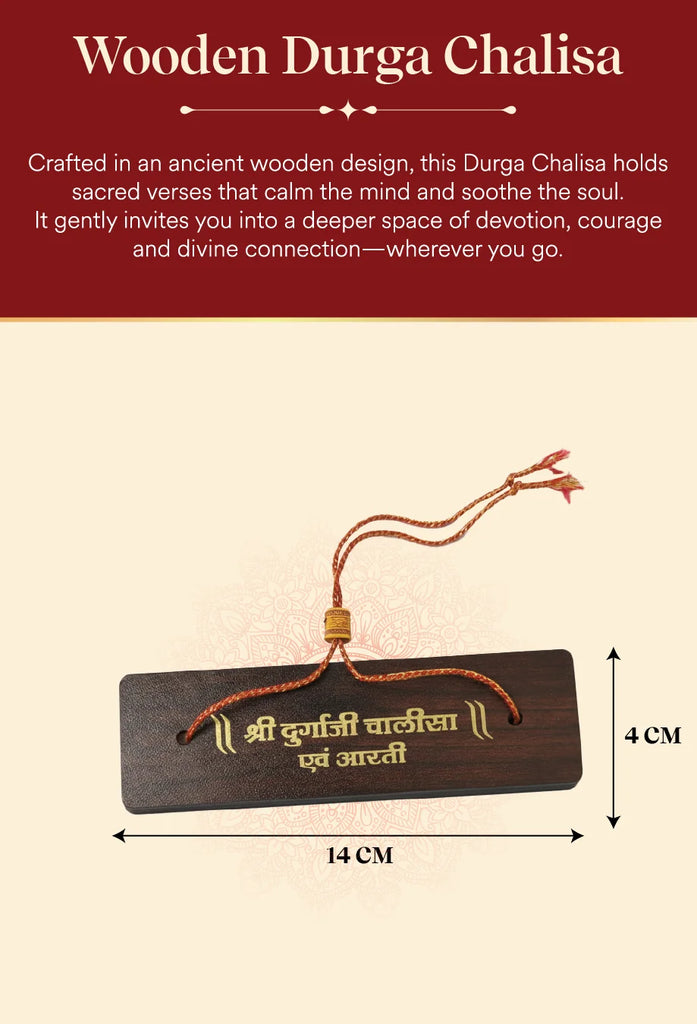 Embrace the divine protection of Maa Durga with this exquisitely crafted Pujashree Wooden Durga Chalisa. The Durga Chalisa, a sacred 40-verse hymn, is one of the most powerful prayers dedicated to the Supreme Goddess. This premium edition is not a perishable paper book but a lasting spiritual keepsake, precisely laser-engraved onto durable, high-quality wood. Each verse is etched with clarity, creating a tactile and sacred experience. This Wooden Durga Chalisa is designed to be a permanent and cherished part of your home temple, inviting the Goddess's shakti (power) and grace into your life every day.